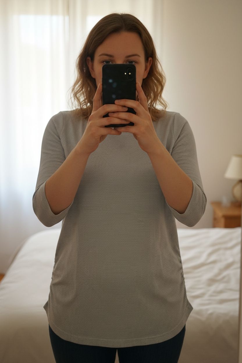 Une personne en Haut rayé blanc et gris debout, face à la caméra, avec une silhouette légèrement plus ronde, dans une chambre à la lumière douce, avec une lumière naturelle filtrant par la fenêtre.