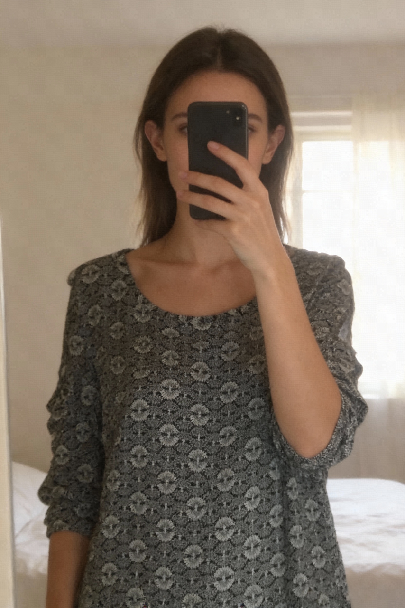Une personne en Haut sans manches géométrique noir/gris debout, face à la caméra, dans une chambre à la lumière douce, avec une lumière naturelle filtrant par la fenêtre.