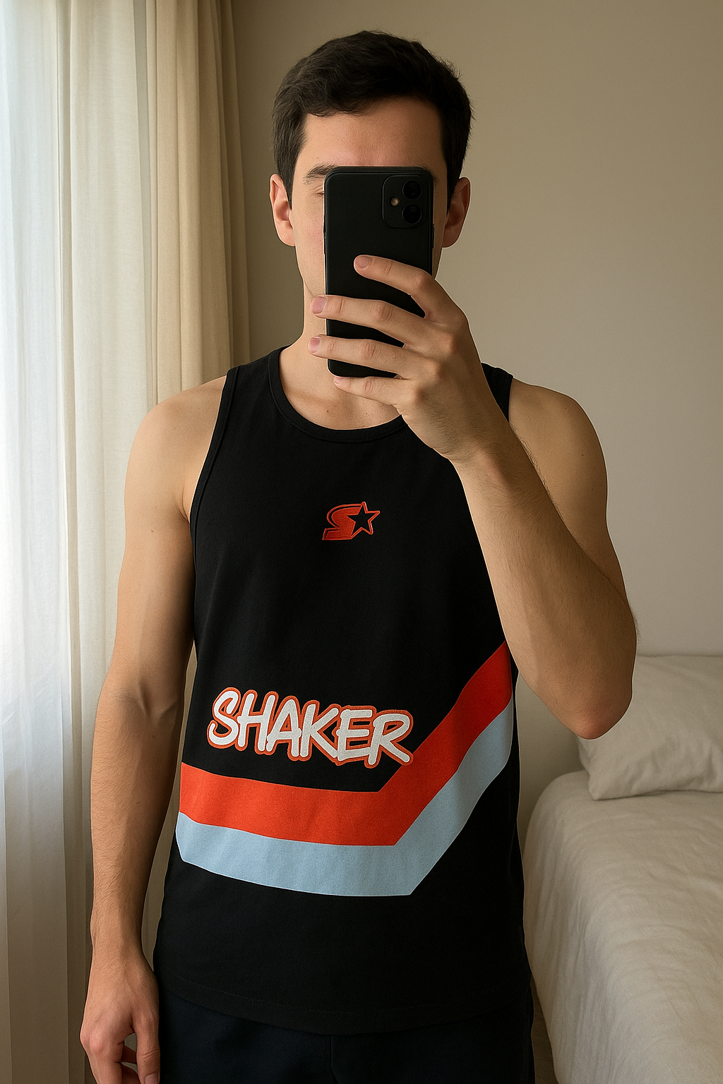 Haut T shirt Starter mixte debout, face à la caméra, dans une chambre à la lumière douce, avec une lumière naturelle filtrant par la fenêtre.