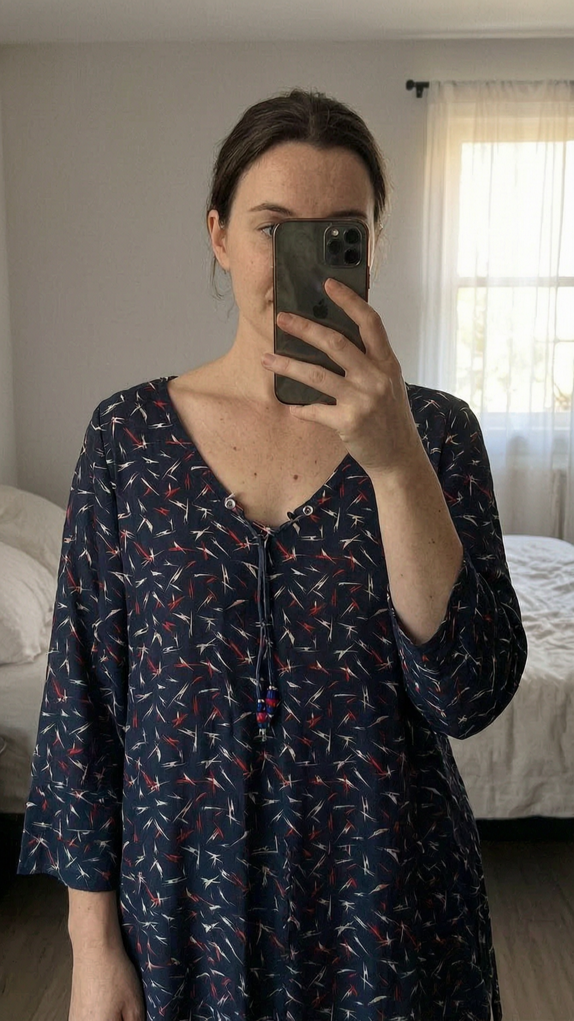 Haut taille xl debout, face à la caméra, dans une chambre à la lumière douce, avec une lumière naturelle filtrant par la fenêtre.