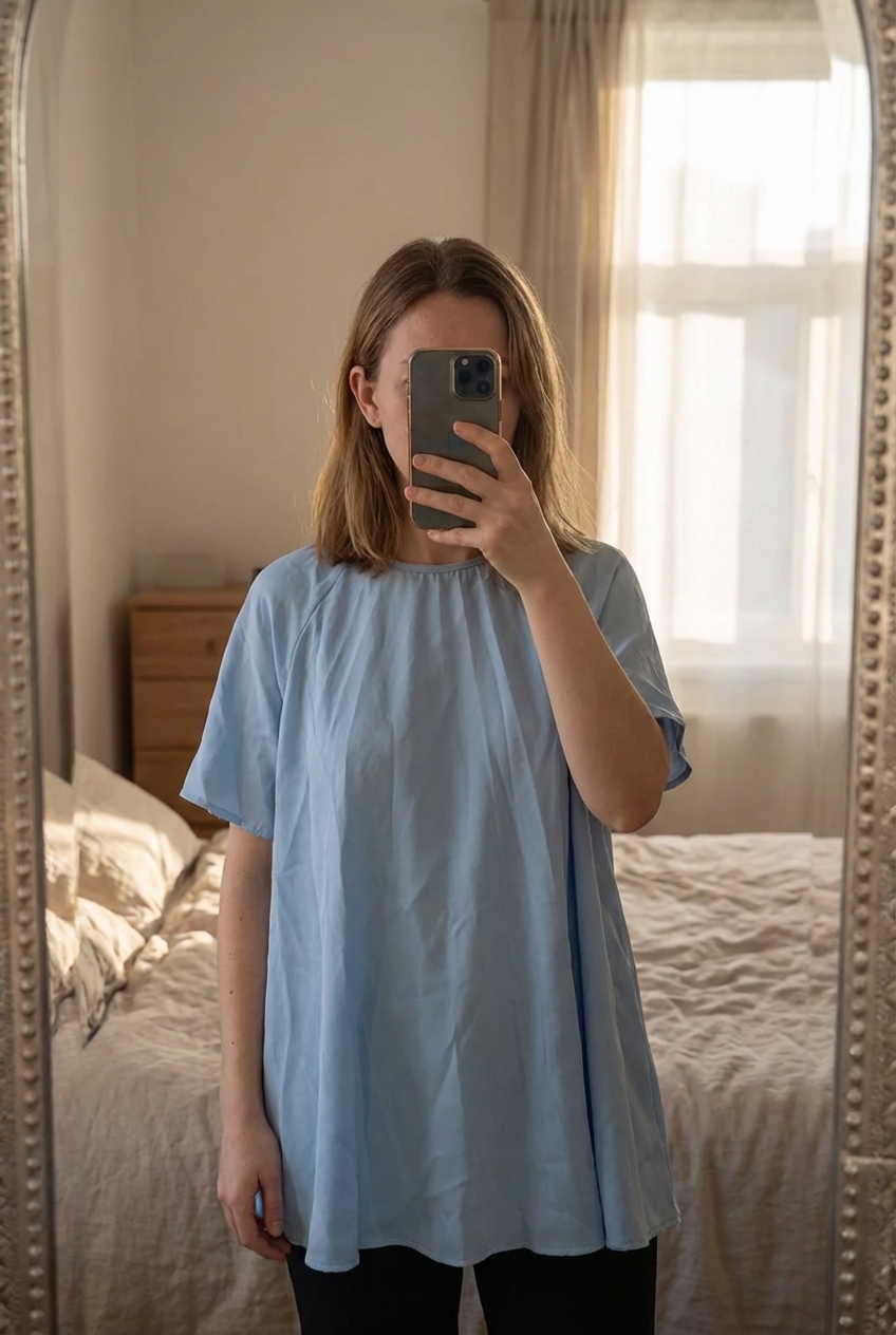 Haut volant debout, face à la caméra, dans une chambre à la lumière douce, avec une lumière naturelle filtrant par la fenêtre.