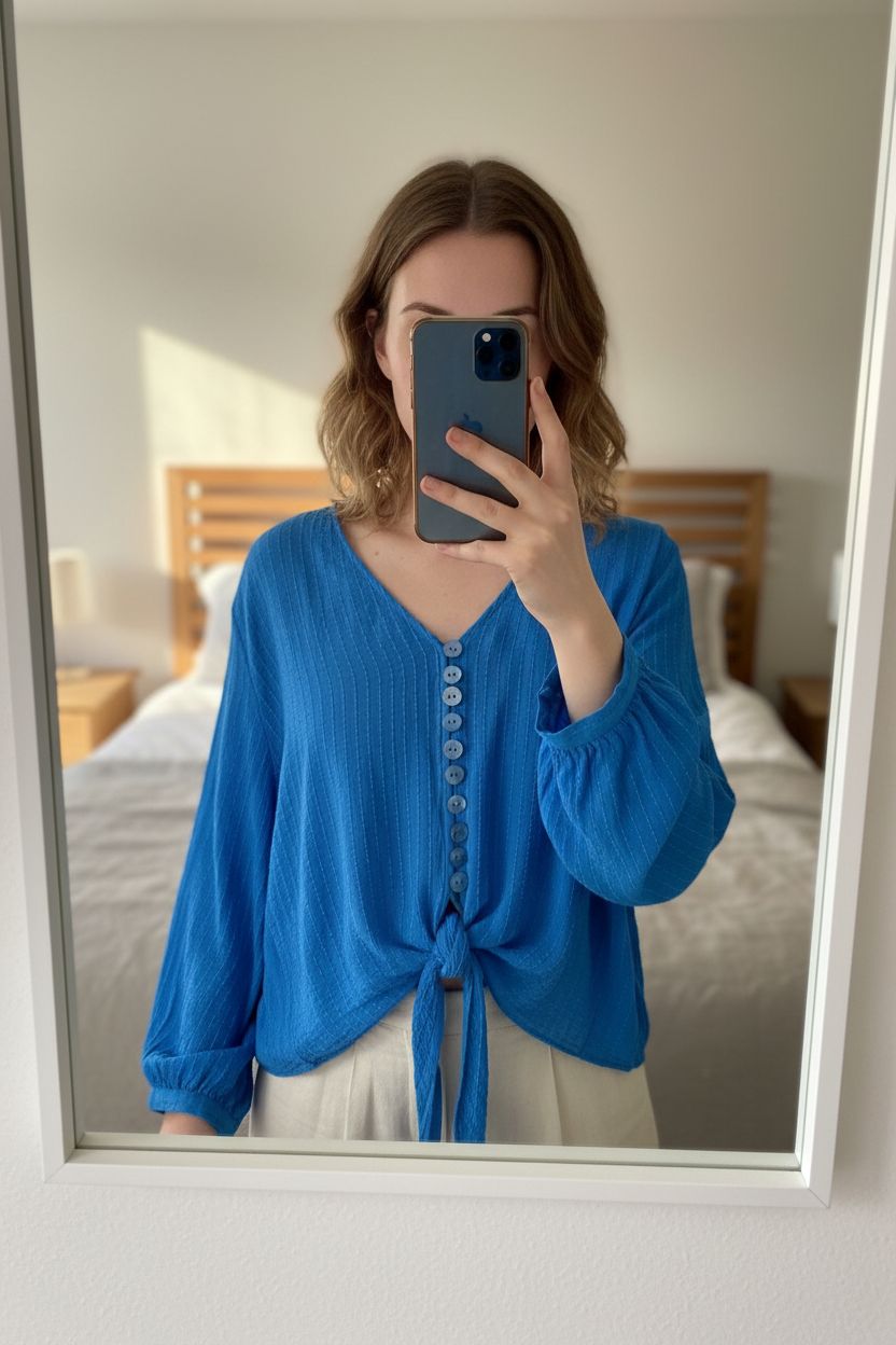 Haut Zara debout, face à la caméra, dans une chambre à la lumière douce, avec une lumière naturelle filtrant par la fenêtre.