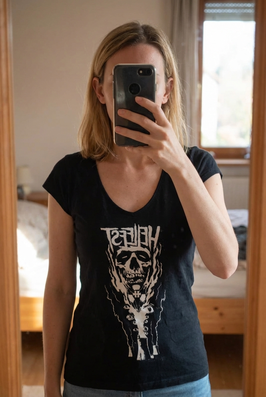 Hellfest 2013 girlie tshirt debout, face à la caméra, dans une chambre à la lumière douce, avec une lumière naturelle filtrant par la fenêtre.