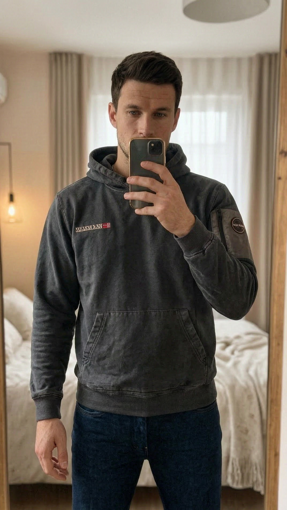 Hoodie Napapijri noir délavé - Patch manche - Taille L debout, face à la caméra, dans une chambre à la lumière douce, avec une lumière naturelle filtrant par la fenêtre.