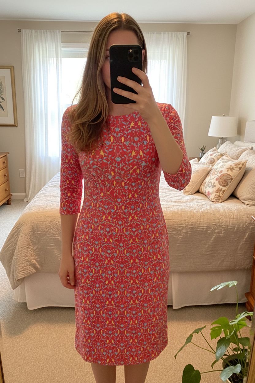 J.McLaughlin Red Floral Bird Print Jersey Dress Size L, 3/4 Sleeve cottagecore standing straight facing the camera, in a softly lit bedroom setting, with gentle natural light filtering through a window.