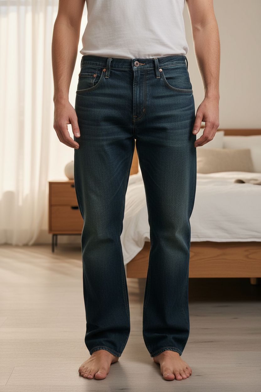 Jean baggy g-star homme debout, face à la caméra, dans une chambre à la lumière douce, avec une lumière naturelle filtrant par la fenêtre.