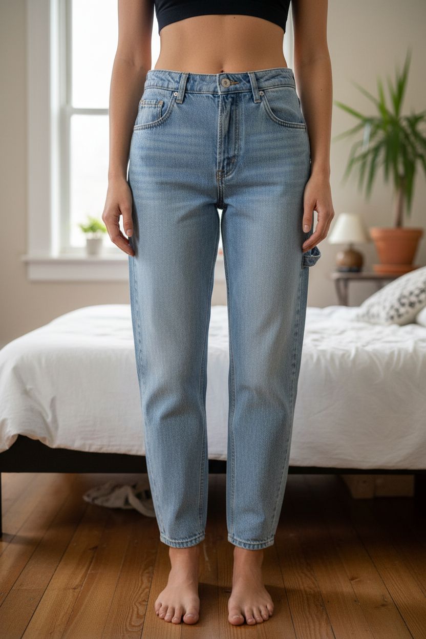Jean ballon Mango taille 34 debout, face à la caméra, dans une chambre à la lumière douce, avec une lumière naturelle filtrant par la fenêtre.