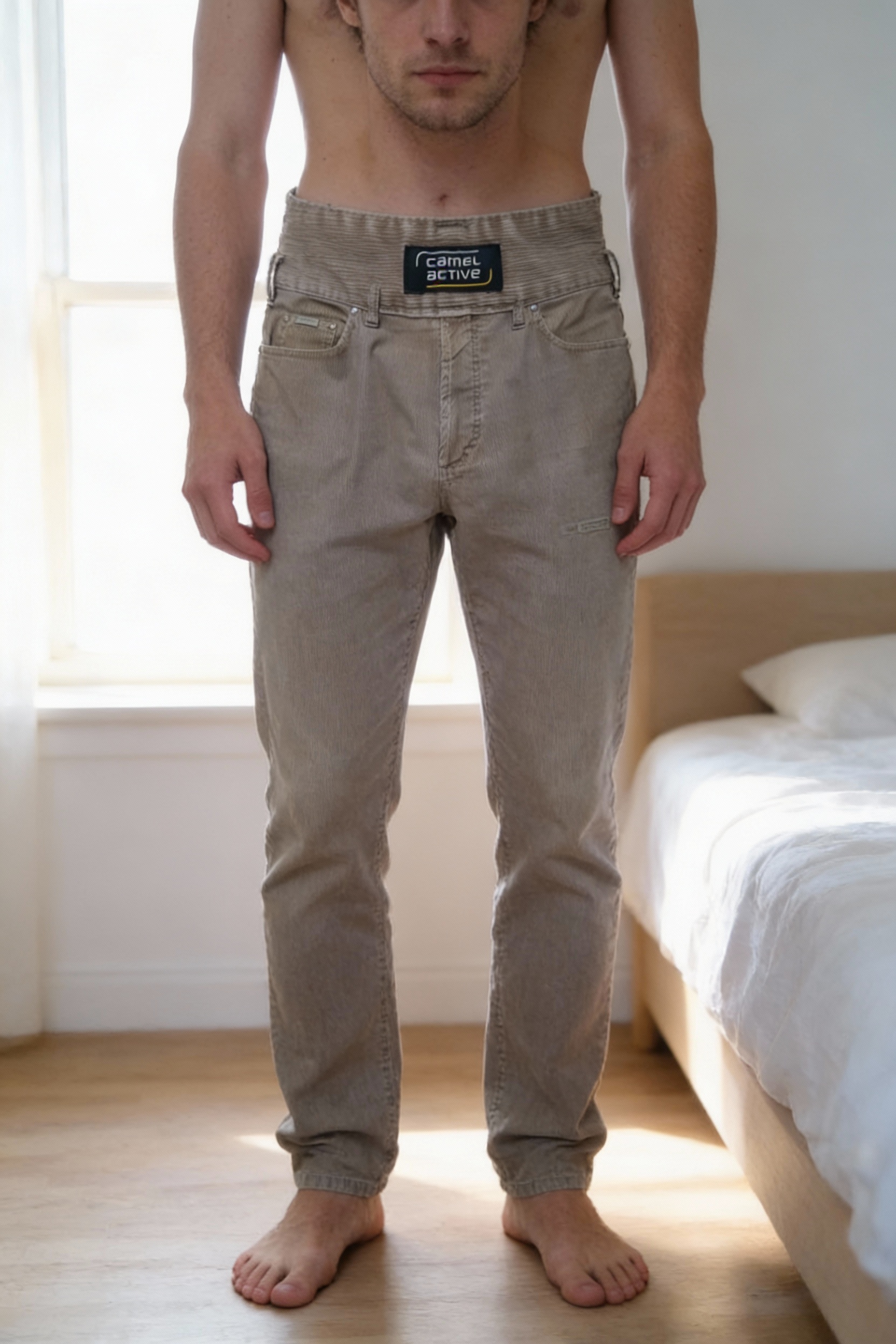 Jean Camel Active en velours côtelé debout, face à la caméra, dans une chambre à la lumière douce, avec une lumière naturelle filtrant par la fenêtre.