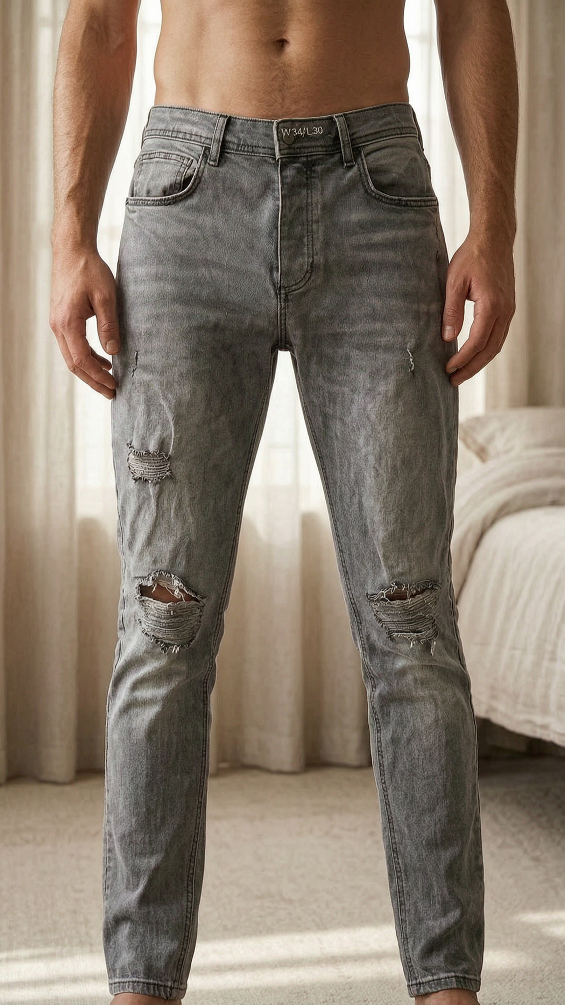 Une personne en Jean Denimco skinny gris délavé effet destroy – taille W34 L30 debout, face à la caméra, dans une chambre à la lumière douce, avec une lumière naturelle filtrant par la fenêtre.