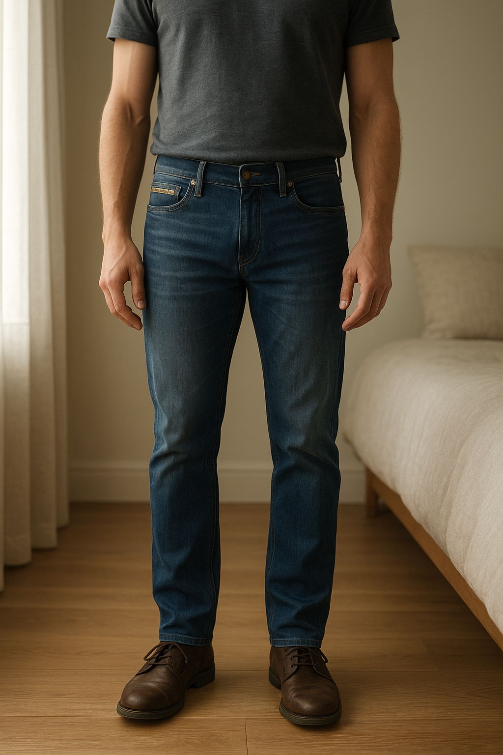 Jean diesel bleu marine taille 31 regular Slim debout, face à la caméra, dans une chambre à la lumière douce, avec une lumière naturelle filtrant par la fenêtre.