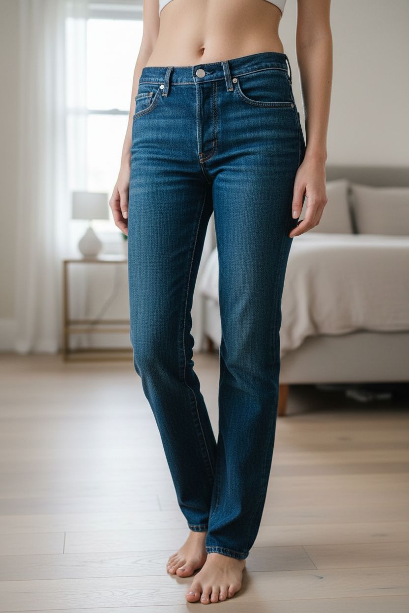 Jean droit DIOR vintage luxe taille 29US debout, face à la caméra, dans une chambre à la lumière douce, avec une lumière naturelle filtrant par la fenêtre.