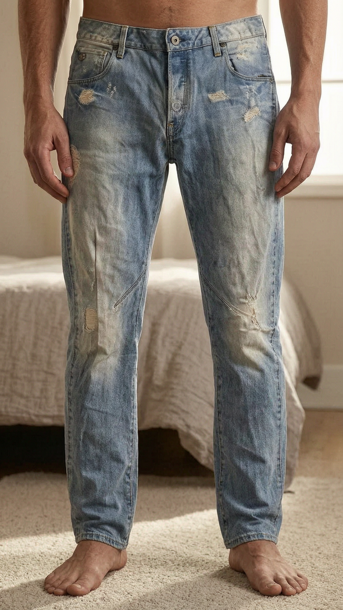 Jean G-Star Raw ARC 3D Slim bleu délavé W32 L32 debout, face à la caméra, dans une chambre à la lumière douce, avec une lumière naturelle filtrant par la fenêtre.