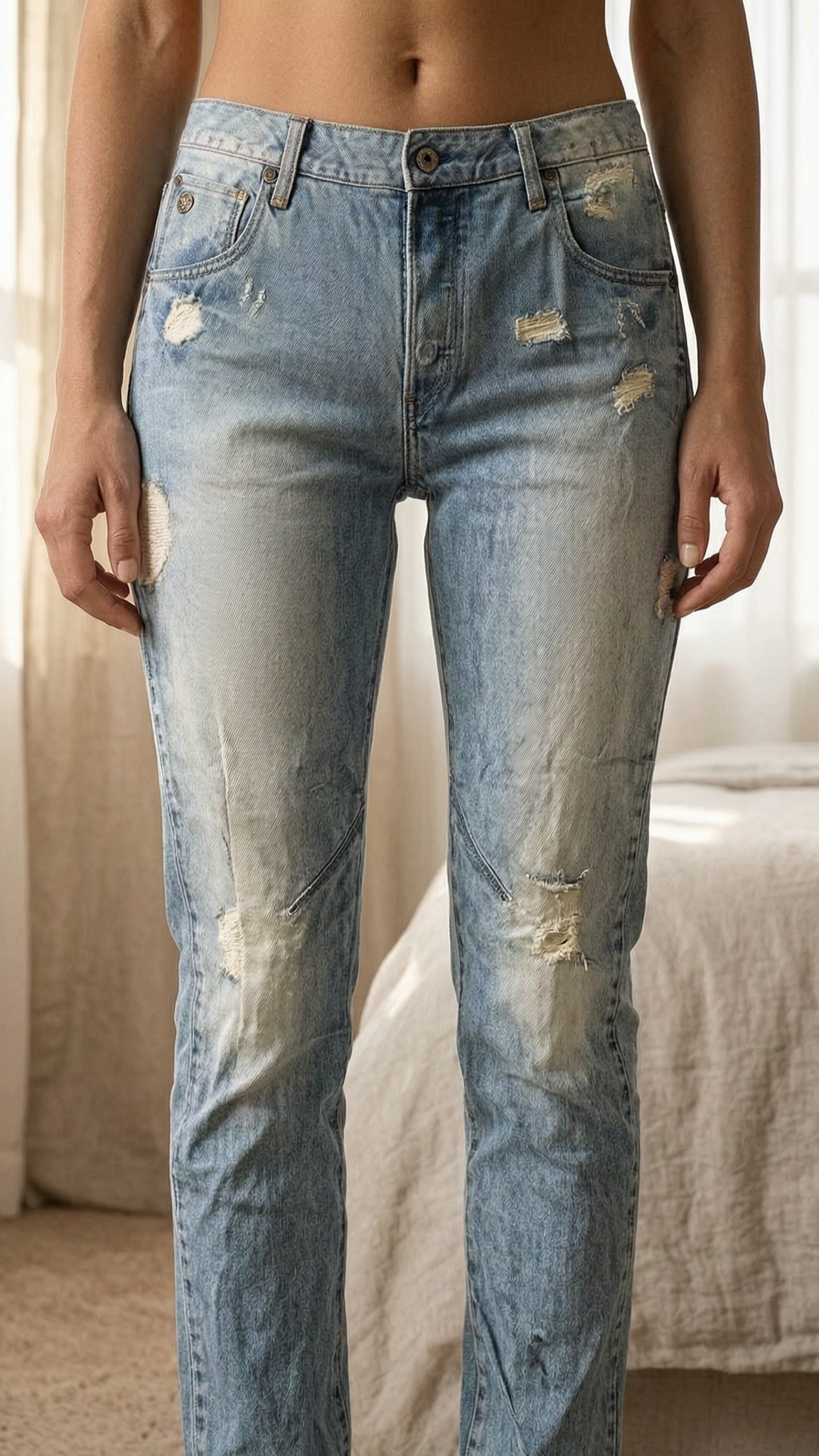 Une personne en Jean G-Star Raw ARC 3D Slim bleu délavé W32 L32 debout, face à la caméra, dans une chambre à la lumière douce, avec une lumière naturelle filtrant par la fenêtre.