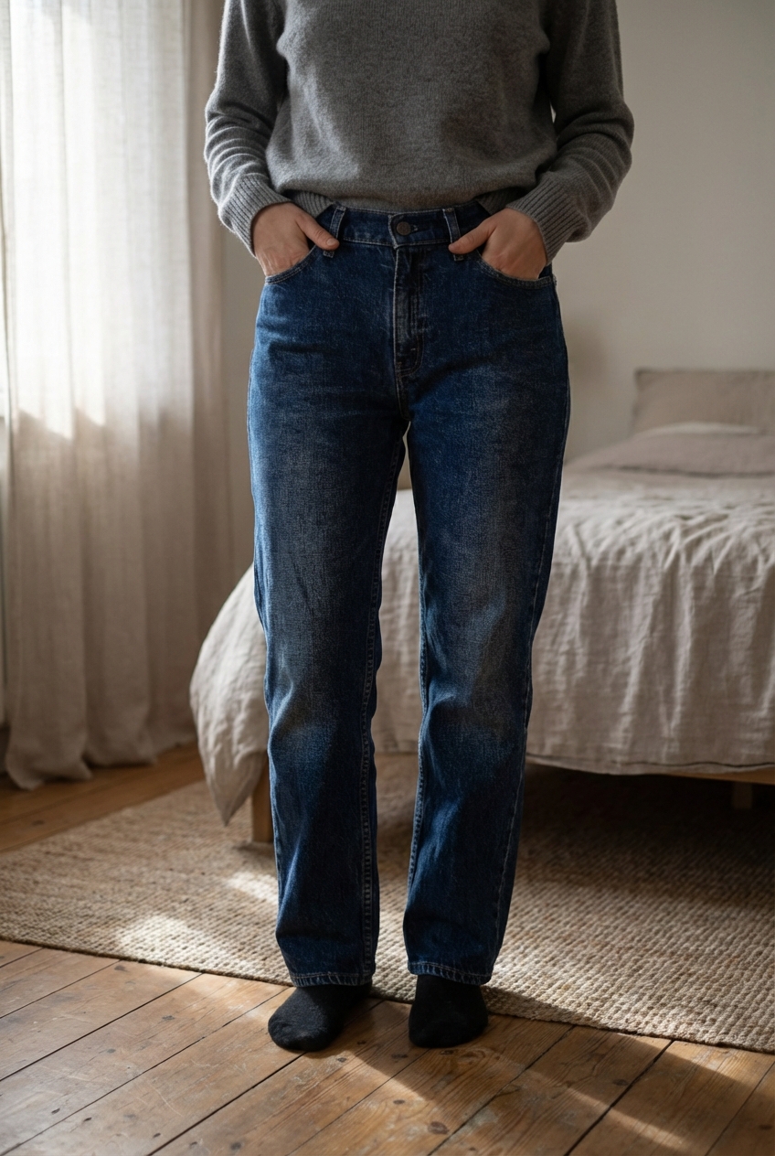 Jean Levi’s debout, face à la caméra, dans une chambre à la lumière douce, avec une lumière naturelle filtrant par la fenêtre.
