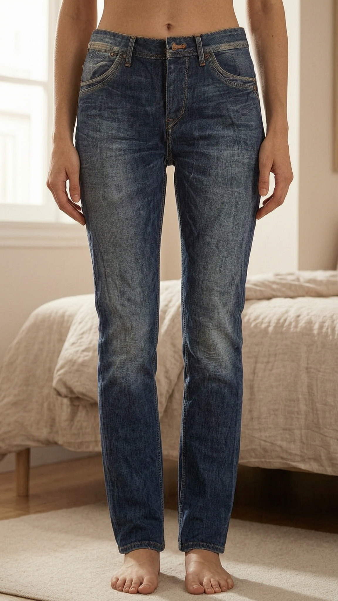 Jean Pepe Jeans London Slim bleu délavé – W31 L34 debout, face à la caméra, dans une chambre à la lumière douce, avec une lumière naturelle filtrant par la fenêtre.
