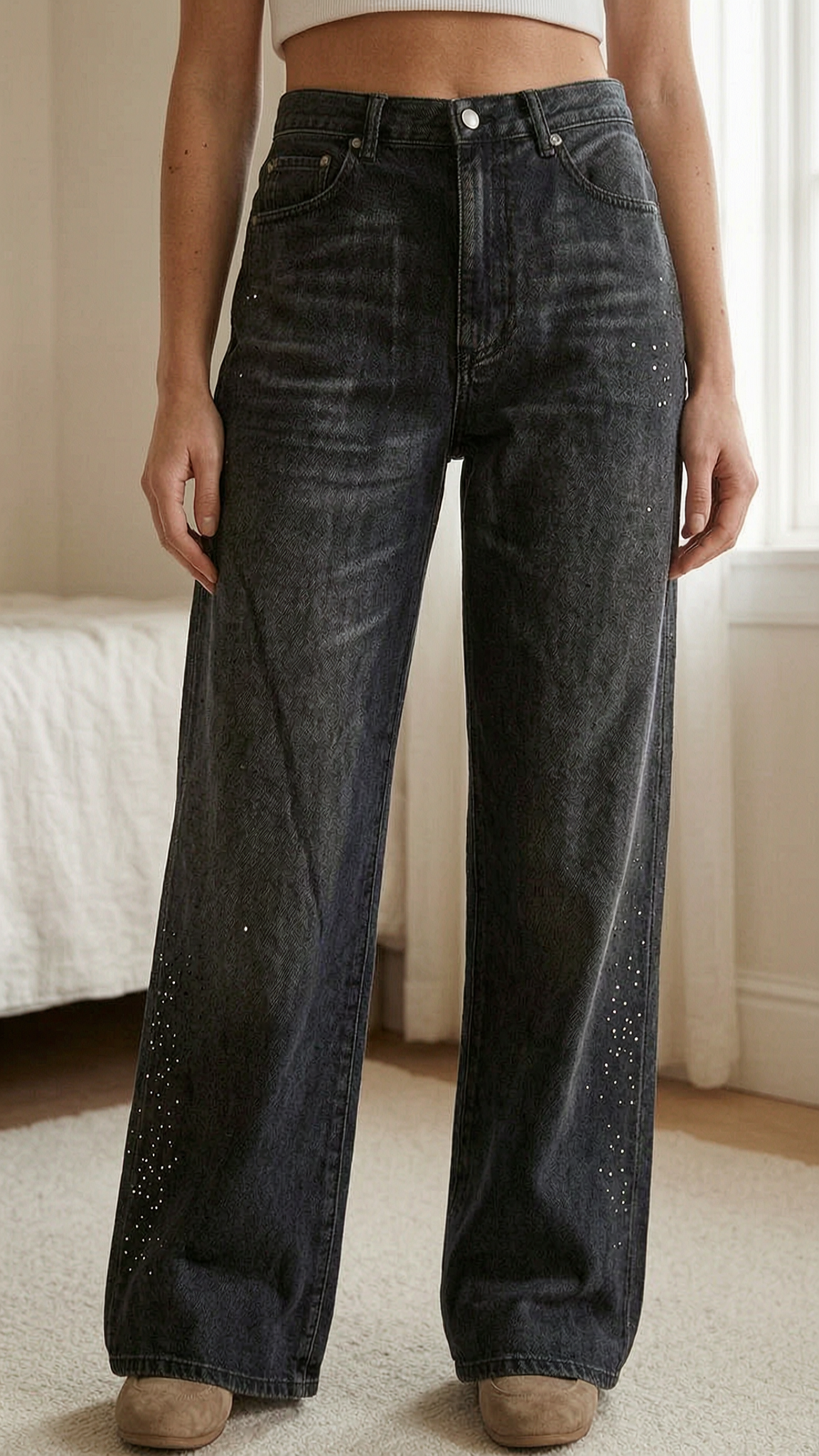 Jean sandro noir strass debout, face à la caméra, dans une chambre à la lumière douce, avec une lumière naturelle filtrant par la fenêtre.