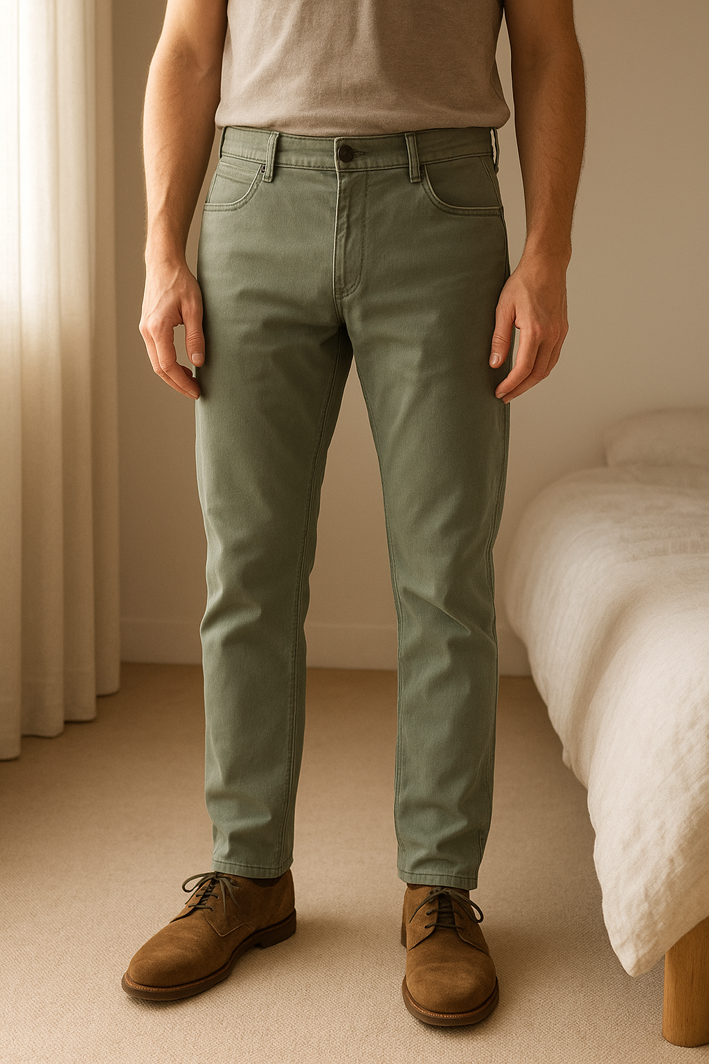 Jean slim fit taille 42 homme vert pastel Kiabi debout, face à la caméra, dans une chambre à la lumière douce, avec une lumière naturelle filtrant par la fenêtre.