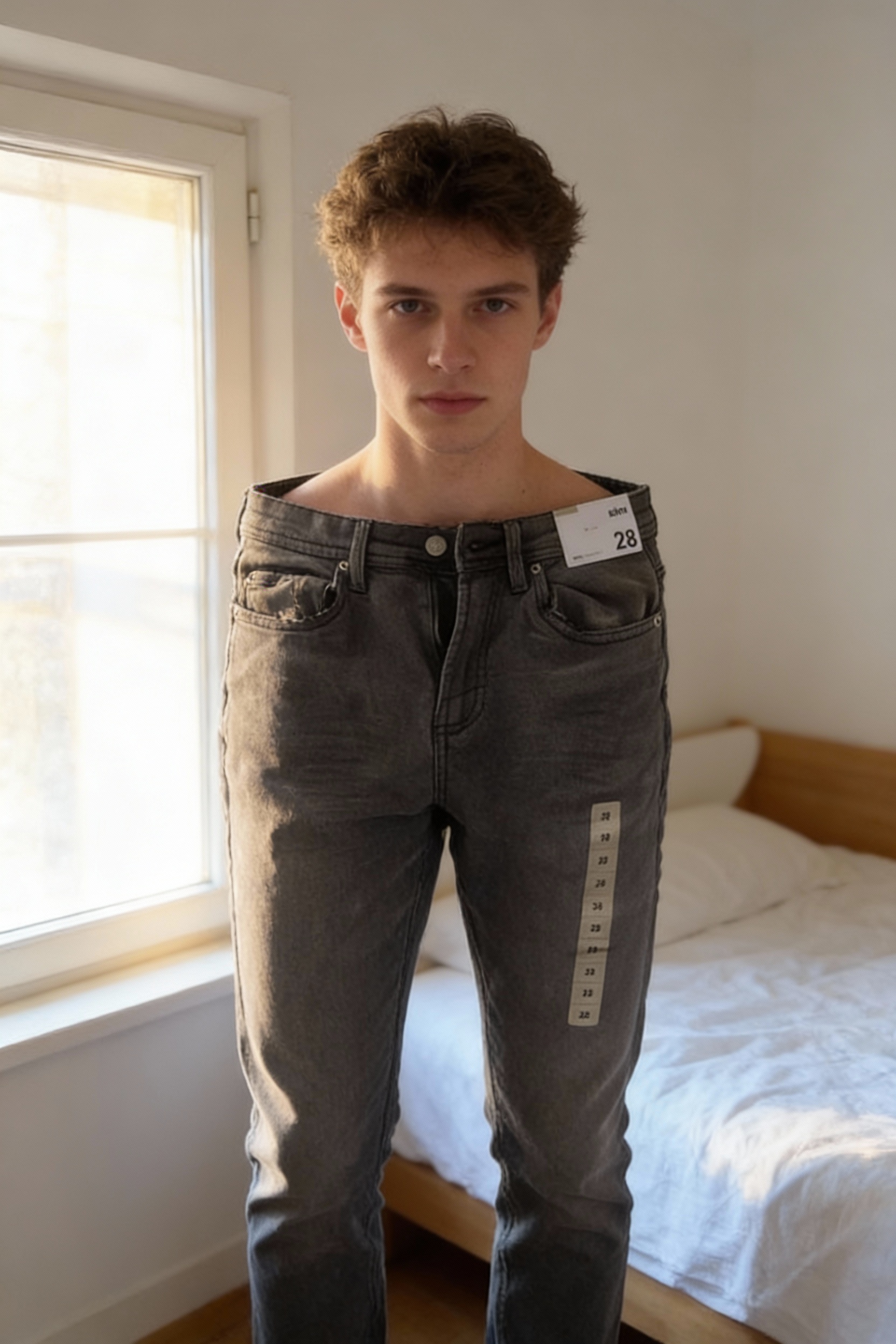Jean slim gris – Sinsay – Taille 28 - 36 fr debout, face à la caméra, dans une chambre à la lumière douce, avec une lumière naturelle filtrant par la fenêtre.