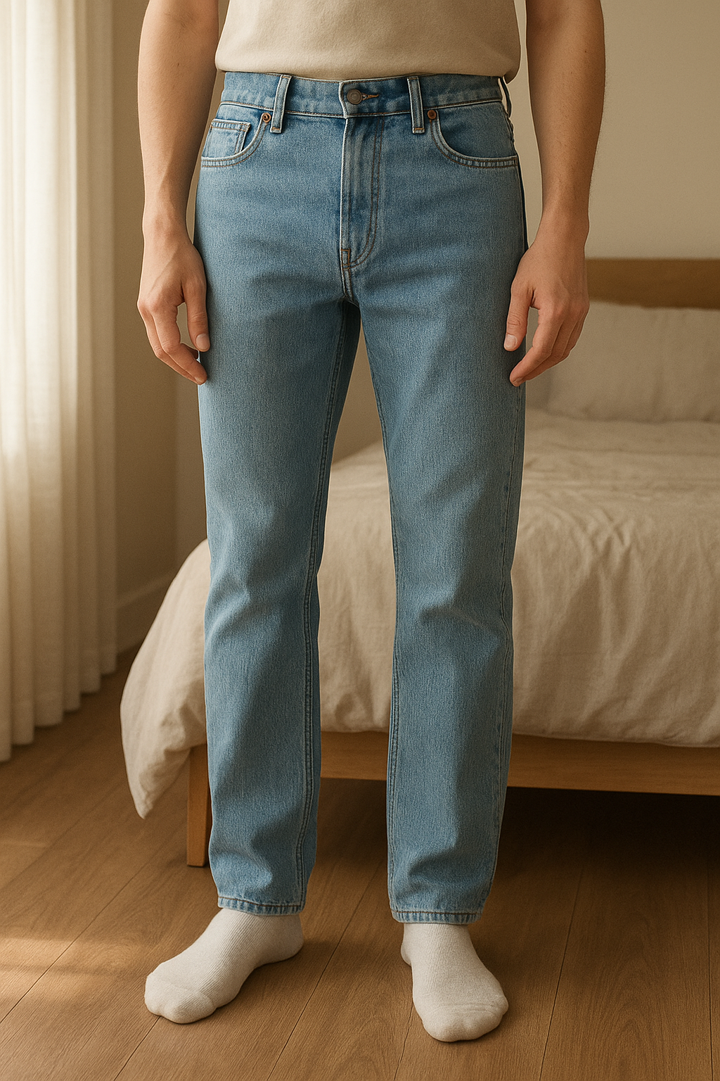 Jean Tommy Hilfiger debout, face à la caméra, dans une chambre à la lumière douce, avec une lumière naturelle filtrant par la fenêtre.