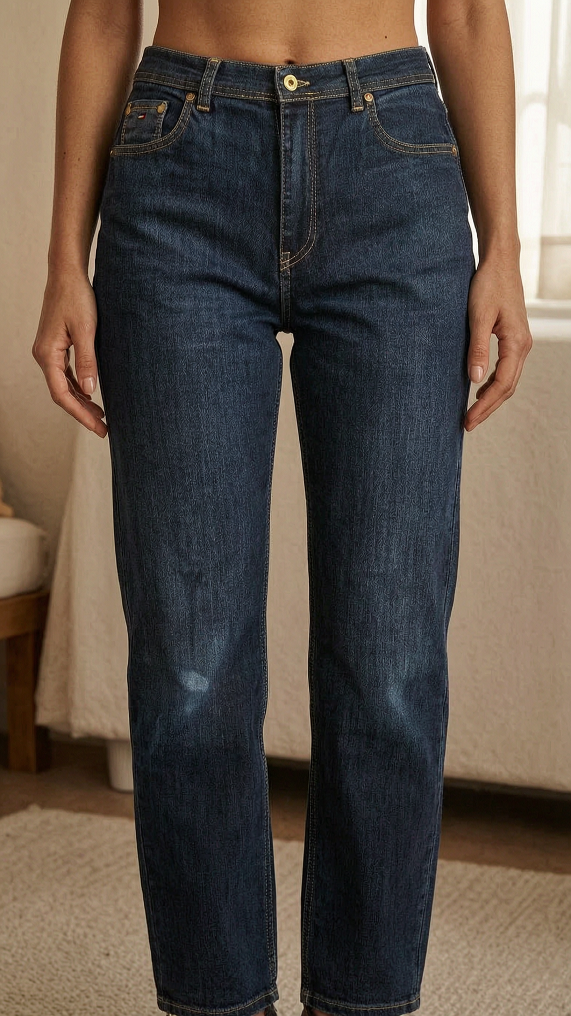 Une personne en Jean Tommy Hilfiger bleu brut – taille 36 debout, face à la caméra, dans une chambre à la lumière douce, avec une lumière naturelle filtrant par la fenêtre.