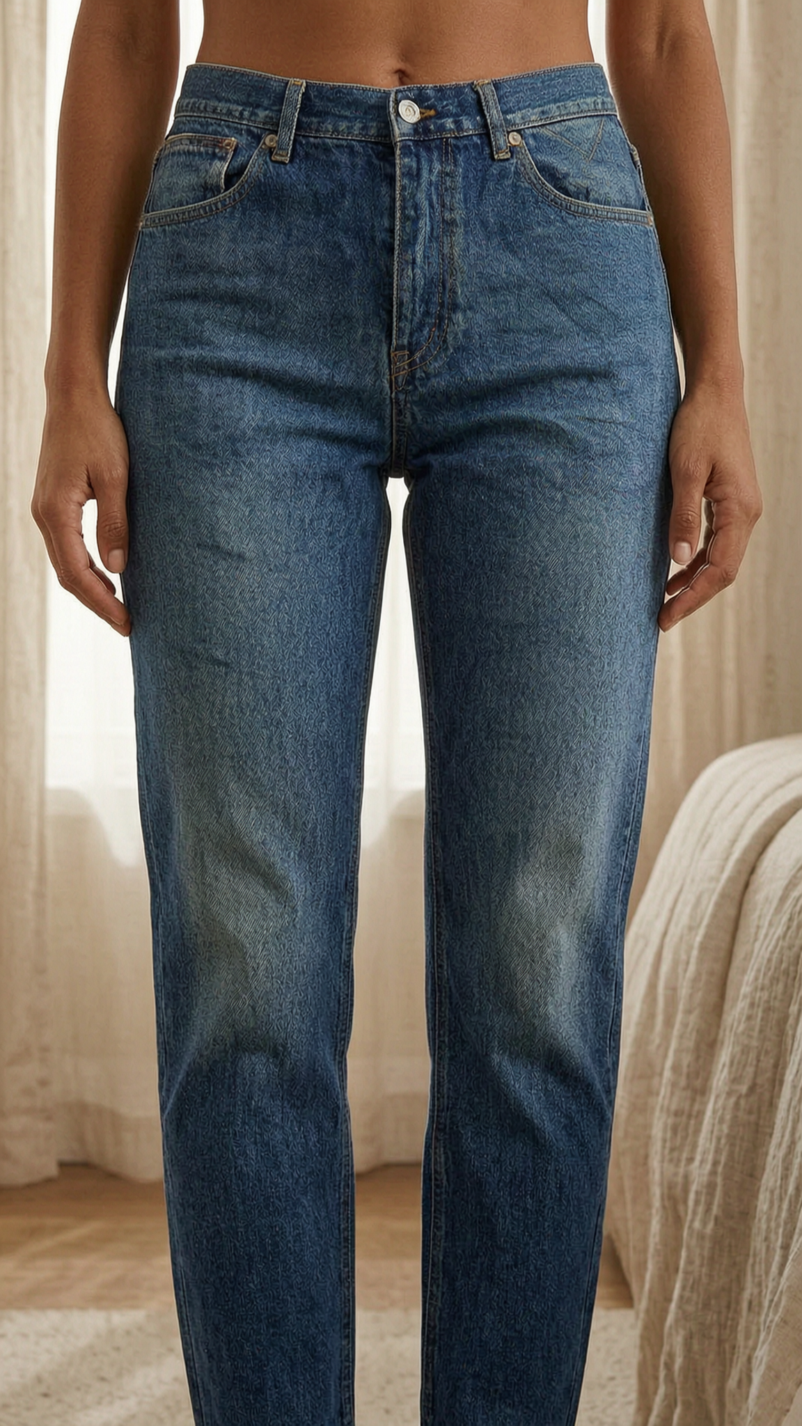 Une personne en Jean Tommy Jeans bleu – taille 34/32 debout, face à la caméra, dans une chambre à la lumière douce, avec une lumière naturelle filtrant par la fenêtre.