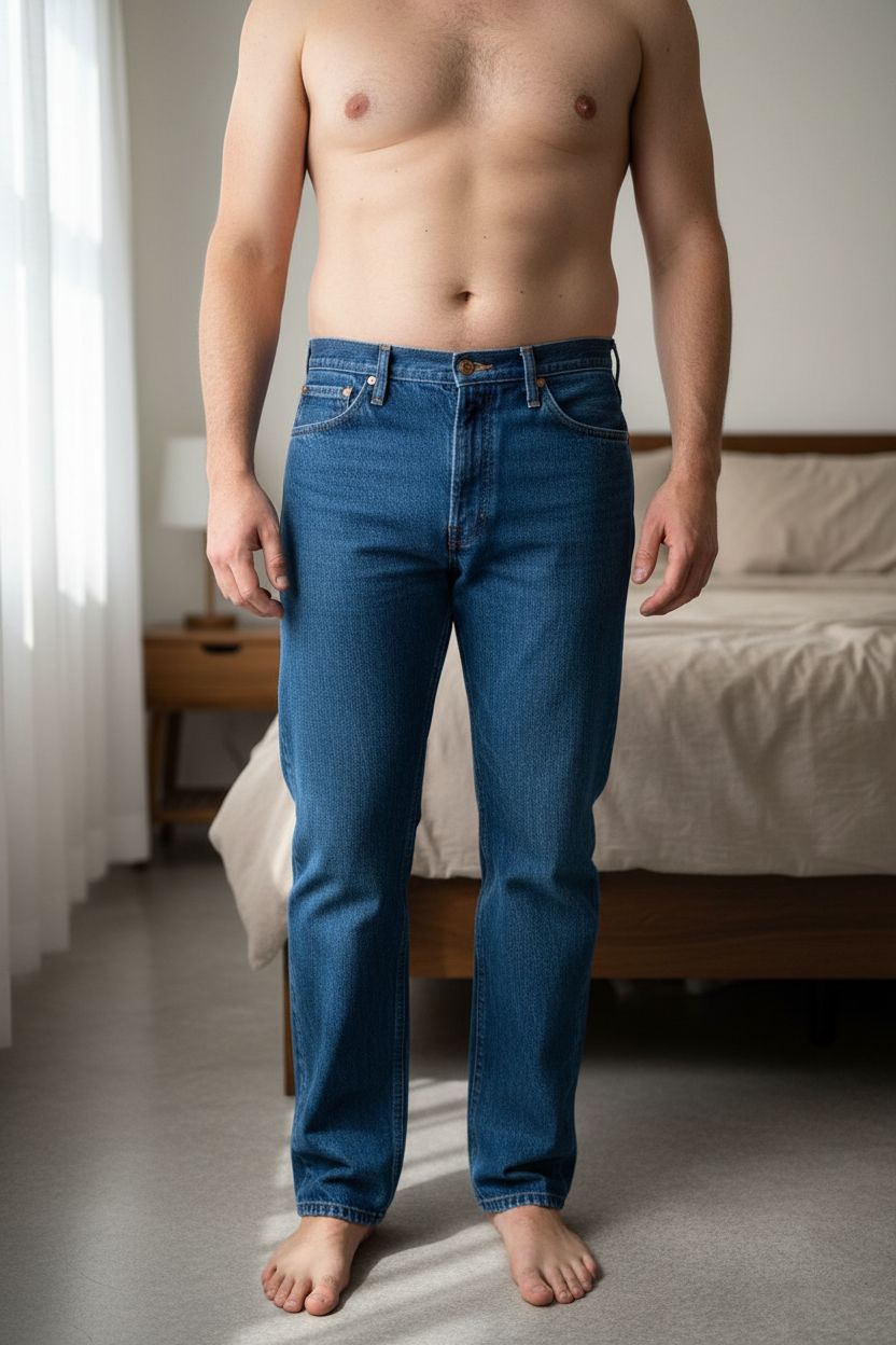 Une personne en Jean Wrangler 936 Cowboy Cut Slim Fit Vintage 2000' Made In USA Y2K 100% Coton Denim Bleu W36 L33 debout, face à la caméra, avec une silhouette légèrement plus ronde, dans une chambre à la lumière douce, avec une lumière naturelle filtrant par la fenêtre.