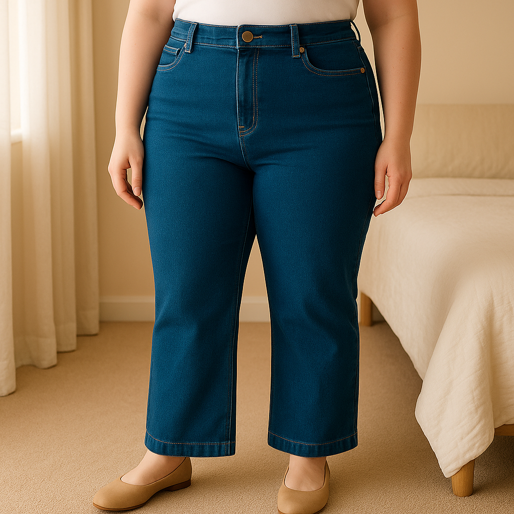Une personne en Jeans 50 femme woman tendance debout, face à la caméra, dans une chambre à la lumière douce, avec une lumière naturelle filtrant par la fenêtre.