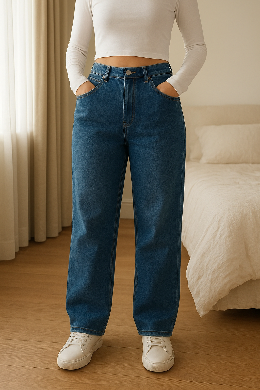 Jeans Coupe Droite Shein debout, face à la caméra, dans une chambre à la lumière douce, avec une lumière naturelle filtrant par la fenêtre.