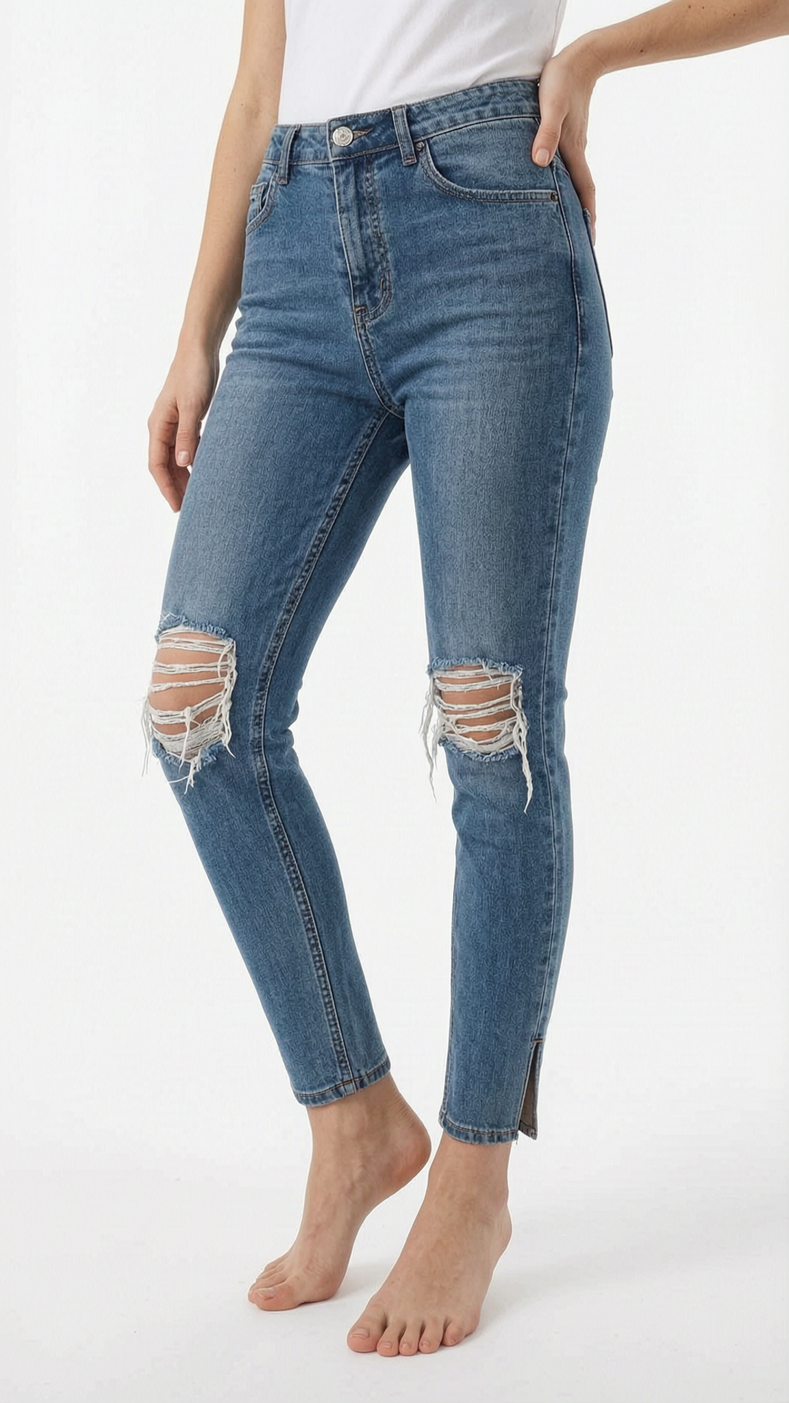 Une personne en Jeans déchiré, couleur bleu, Taille 36, Marque Zara cambrant légèrement le dos pour une pose dynamique, dans un studio photo épuré avec fond blanc et éclairage doux.