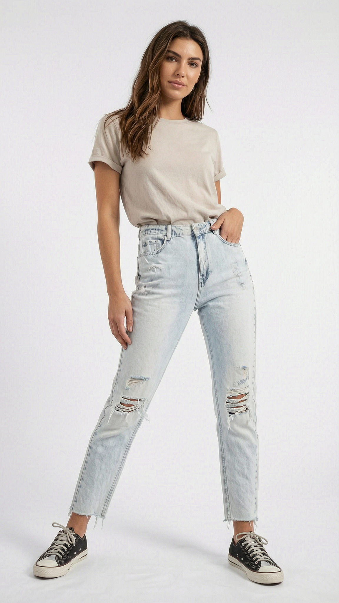Une personne en Jeans déchiré, couleur bleu très clair, Taille 38, Marque Denim Pimkie cambrant légèrement le dos pour une pose dynamique, dans un studio photo épuré avec fond blanc et éclairage doux.