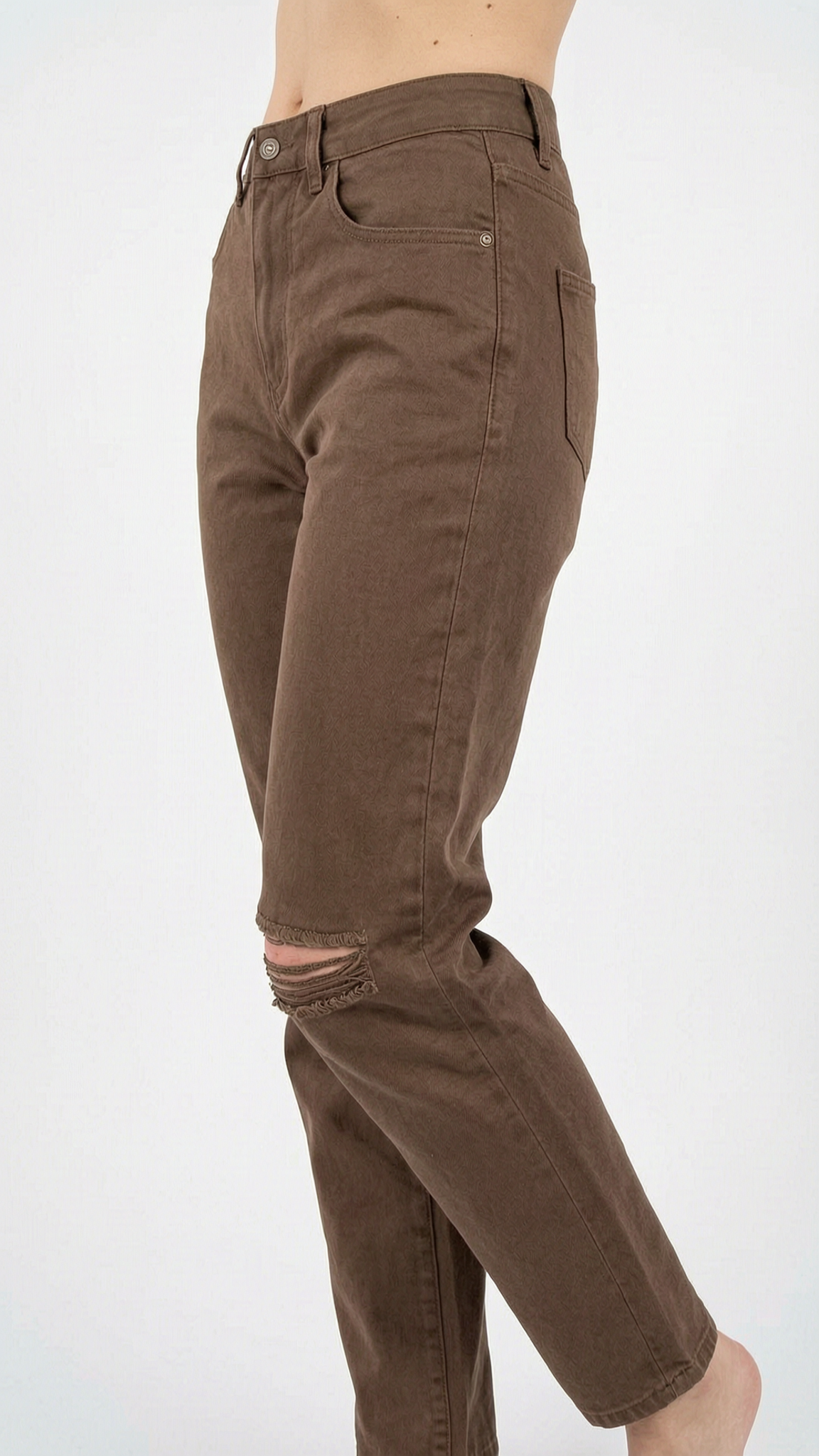 Une personne en Jeans femme, style déchiré Taille 38, couleur marron cambrant légèrement le dos pour une pose dynamique, dans un studio photo épuré avec fond blanc et éclairage doux.