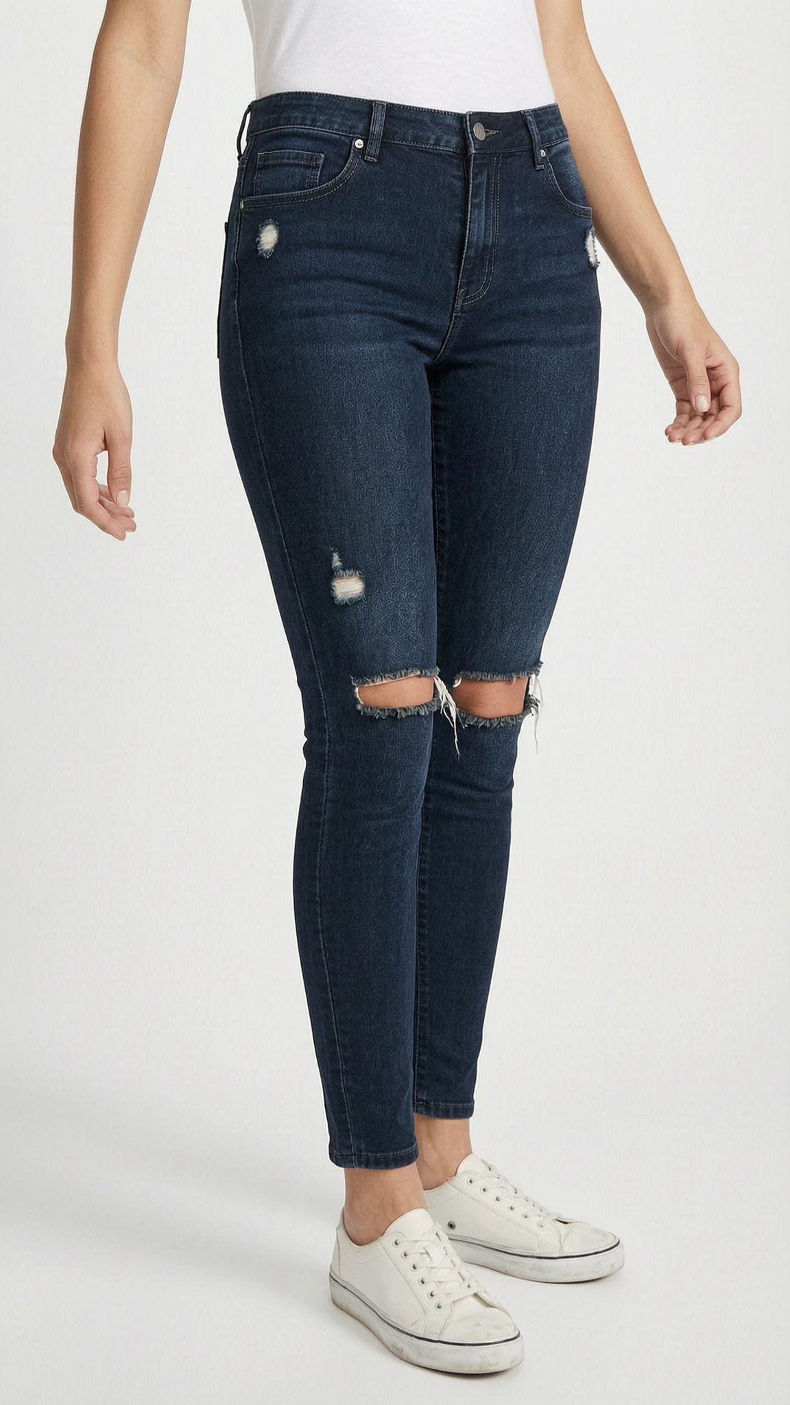 Une personne en Jeans femme "Style déchiré " - Taille 44 - Marque H&M - couleur bleue cambrant légèrement le dos pour une pose dynamique, dans un studio photo épuré avec fond blanc et éclairage doux.