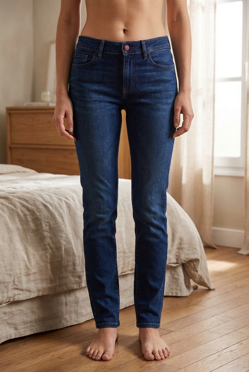 Jeans push up debout, face à la caméra, dans une chambre à la lumière douce, avec une lumière naturelle filtrant par la fenêtre.