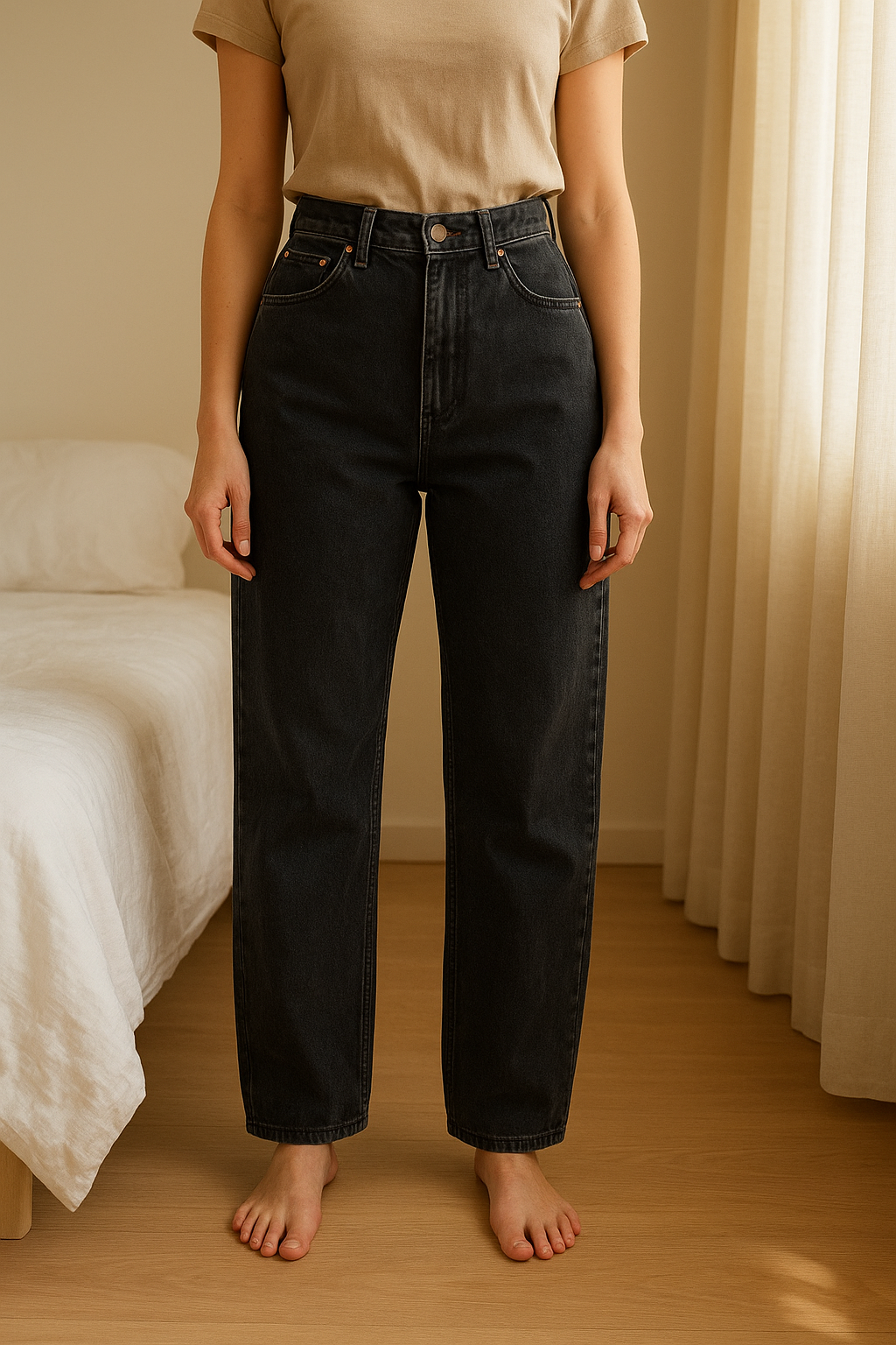 👖🖤jeans vintage nero a vita alta modello Mom Fit,Pull&bear-taglia 40 -comoda veste anche 42 in piedi, rivolto verso la fotocamera, in una camera da letto con luce soffusa e luce naturale che filtra dalla finestra.
