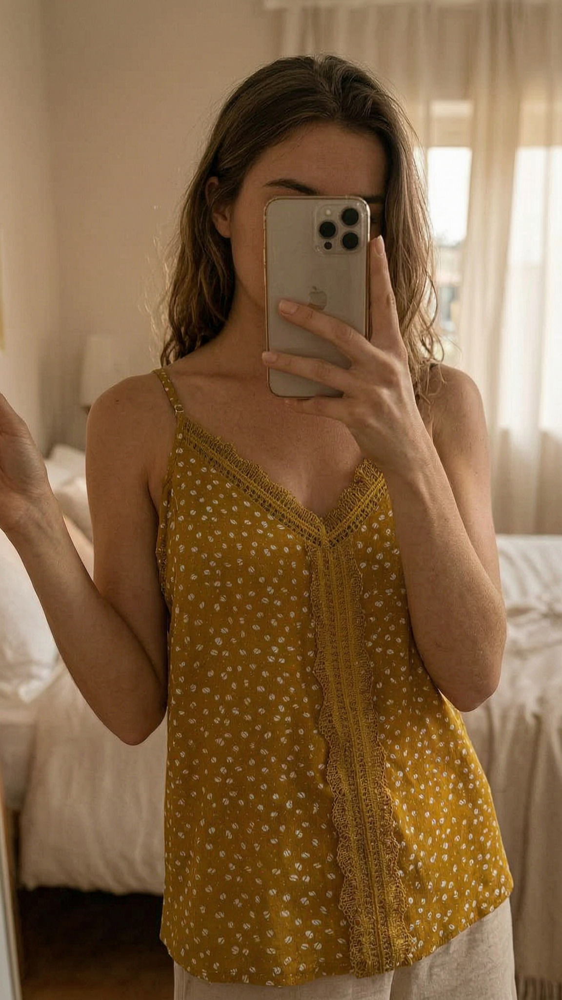 Une personne en Joli débardeur à bretelles moutarde Promod taille 38 cambrant légèrement le dos pour une pose dynamique, avec une silhouette fine, dans une chambre à la lumière douce, avec une lumière naturelle filtrant par la fenêtre.