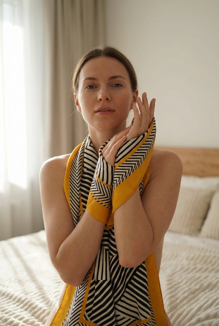 Une personne en Joli foulard debout, face à la caméra, dans une chambre à la lumière douce, avec une lumière naturelle filtrant par la fenêtre.