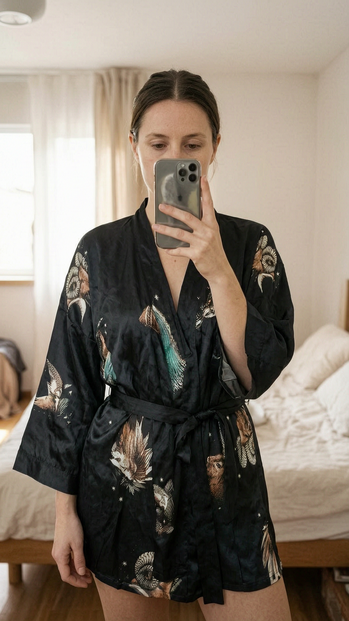 Joli kimono satiné etam debout, face à la caméra, dans une chambre à la lumière douce, avec une lumière naturelle filtrant par la fenêtre.