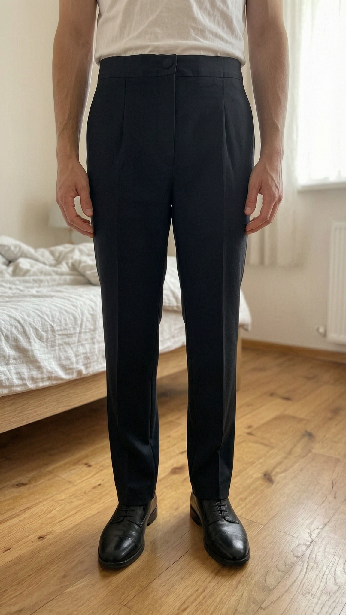 Joli pantalon, noir, dolce, Dolce Gabbana, it 38 debout, face à la caméra, dans une chambre à la lumière douce, avec une lumière naturelle filtrant par la fenêtre.