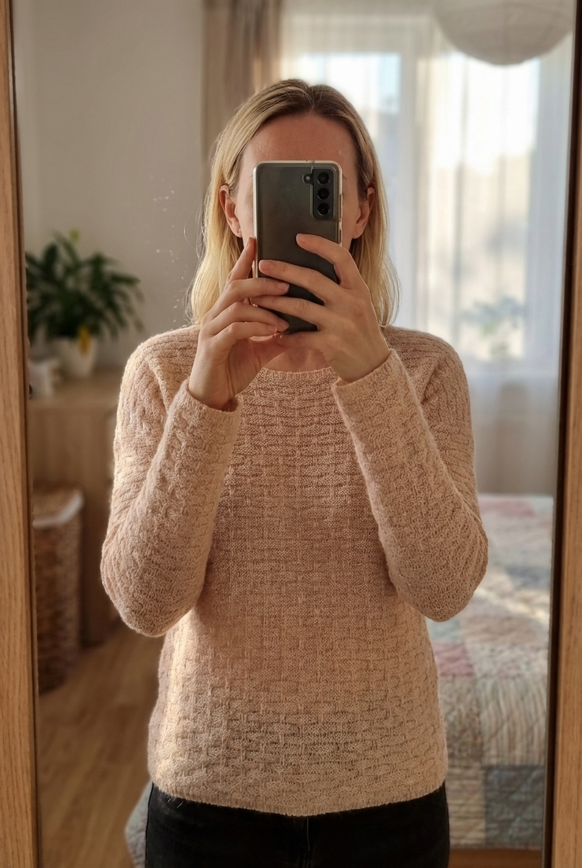 Joli pull beige rosé fils métallisés or debout, face à la caméra, dans une chambre à la lumière douce, avec une lumière naturelle filtrant par la fenêtre.