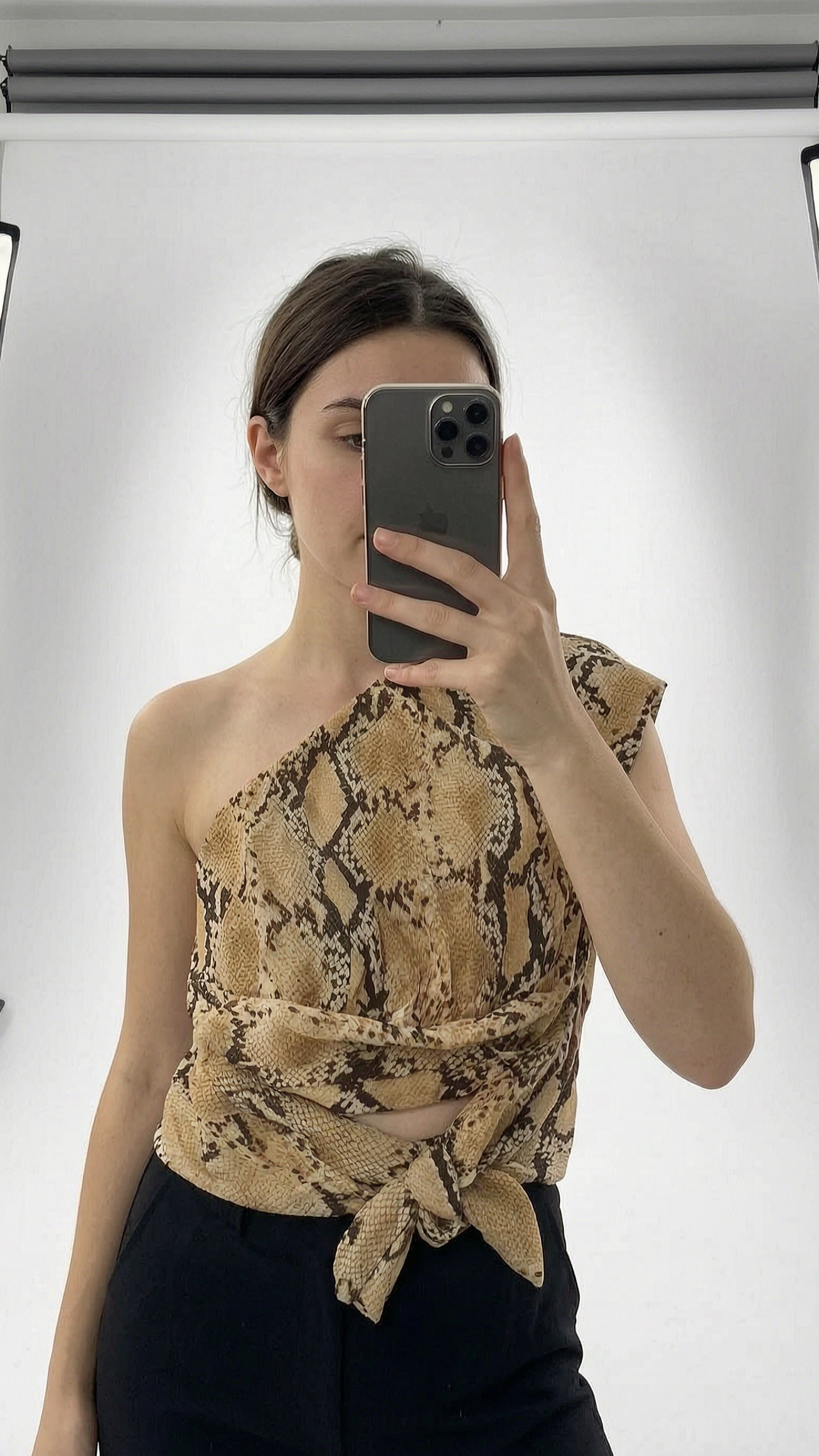 Une personne en Joli top, imprimé serpent, taille S, Marque H&M cambrant légèrement le dos pour une pose dynamique, dans un studio photo épuré avec fond blanc et éclairage doux.