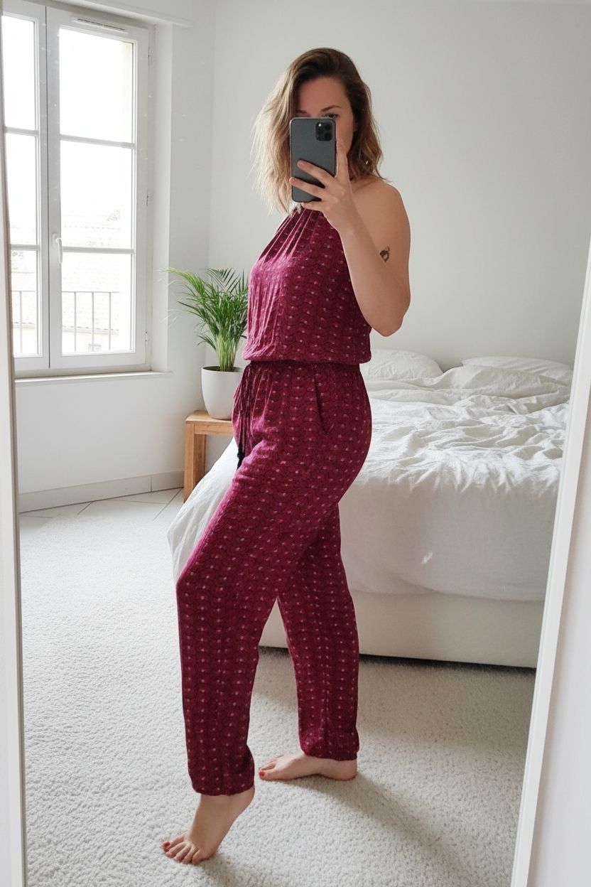 Une personne en Jolie combinaison de créateur colorée fluide pour l'été cambrant légèrement le dos pour une pose dynamique, dans une chambre à la lumière douce, avec une lumière naturelle filtrant par la fenêtre.