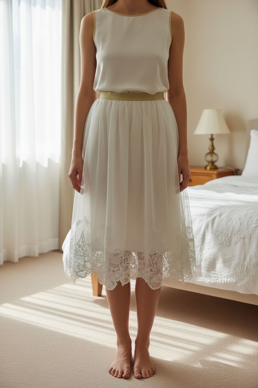 Jolie jupe Suncoo neuve debout, face à la caméra, dans une chambre à la lumière douce, avec une lumière naturelle filtrant par la fenêtre.