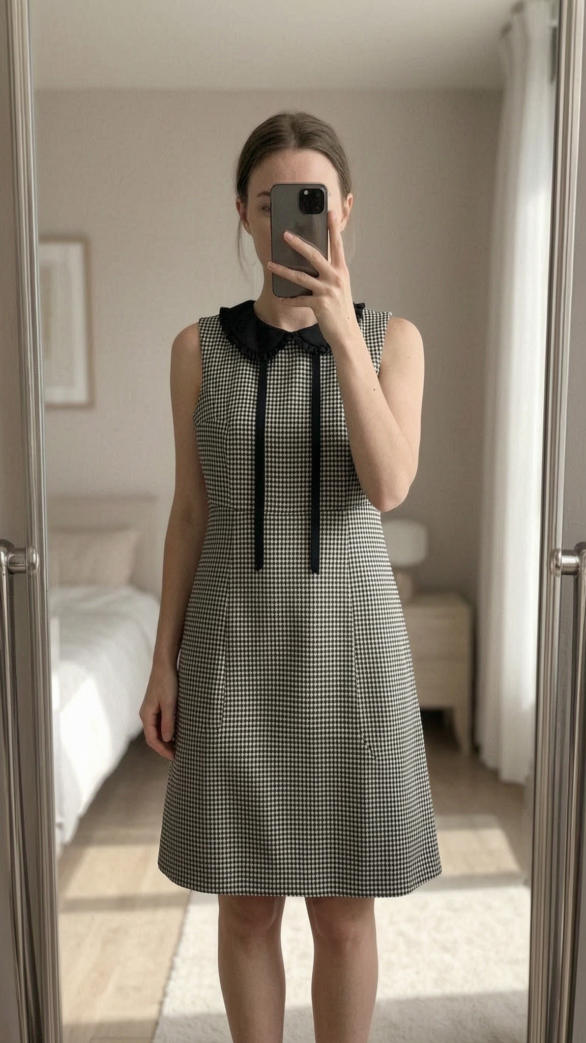 Jolie robe debout, face à la caméra, dans une chambre à la lumière douce, avec une lumière naturelle filtrant par la fenêtre.