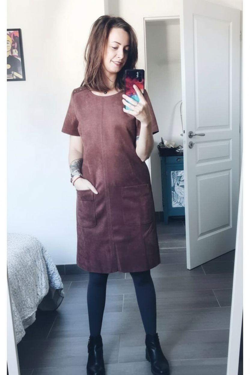 Une personne en Jolie robe simili daim Bonobo cambrant légèrement le dos pour une pose dynamique, dans une chambre à la lumière douce, avec une lumière naturelle filtrant par la fenêtre.