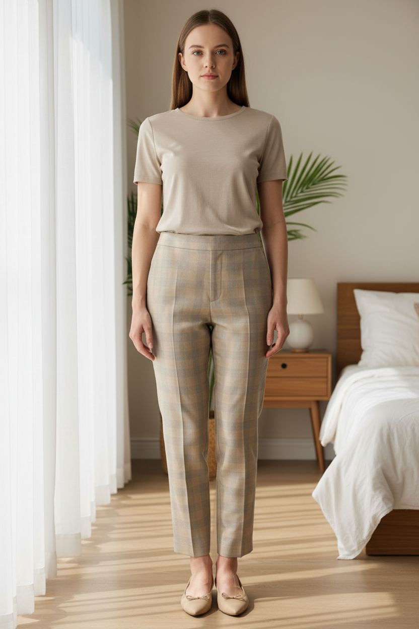Jupe à carreaux debout, face à la caméra, dans une chambre à la lumière douce, avec une lumière naturelle filtrant par la fenêtre.