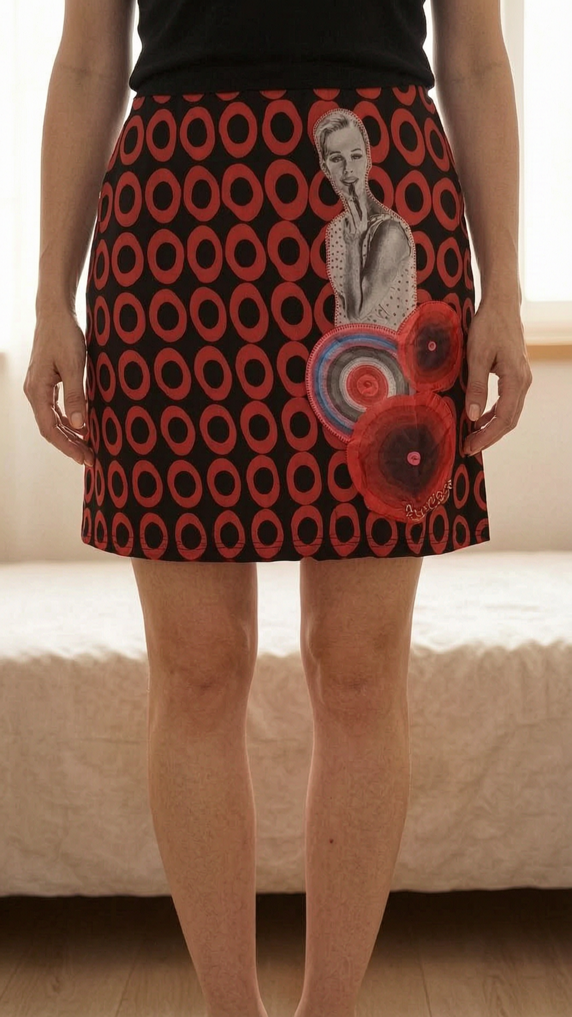Jupe desigual debout, face à la caméra, dans une chambre à la lumière douce, avec une lumière naturelle filtrant par la fenêtre.