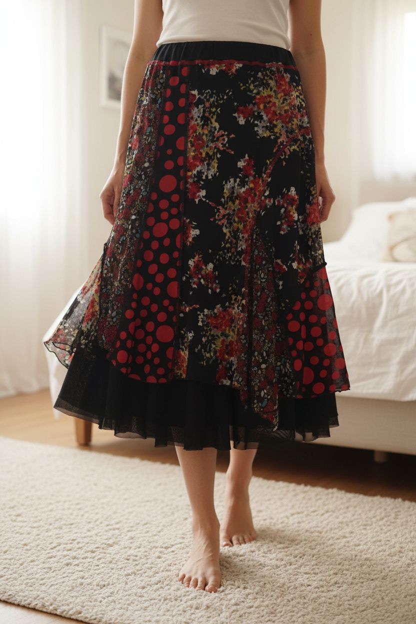 Jupe femme debout, face à la caméra, dans une chambre à la lumière douce, avec une lumière naturelle filtrant par la fenêtre.