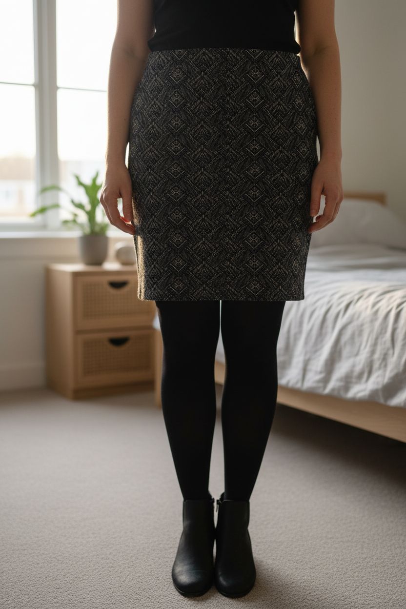 Une personne en Jupe hiver promod debout, face à la caméra, avec une silhouette légèrement plus ronde, dans une chambre à la lumière douce, avec une lumière naturelle filtrant par la fenêtre.