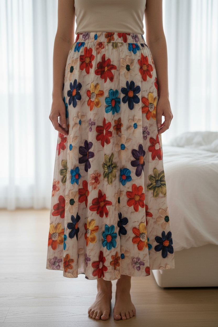 Jupe longue d'été, jolies fleurs, bohème debout, face à la caméra, dans une chambre à la lumière douce, avec une lumière naturelle filtrant par la fenêtre.