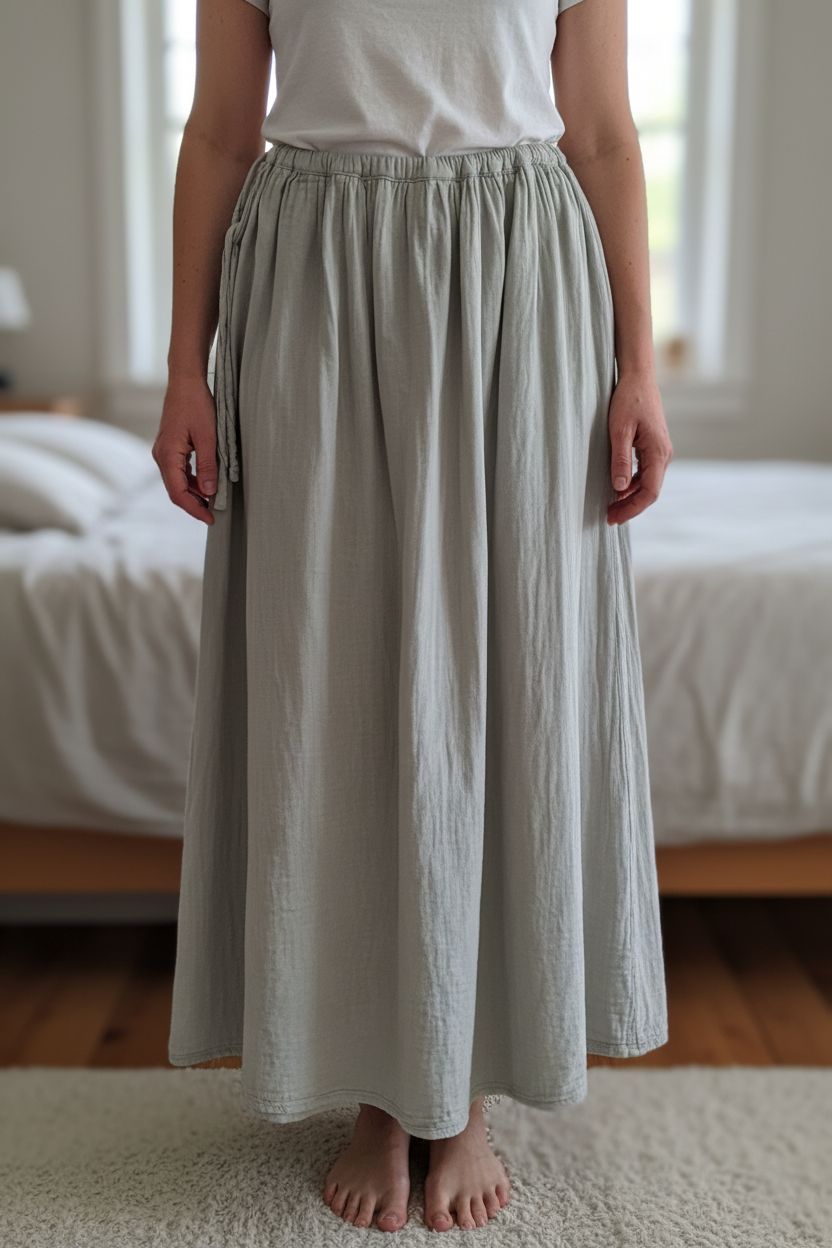 Jupe longue en gaze vert pastel debout, face à la caméra, dans une chambre à la lumière douce, avec une lumière naturelle filtrant par la fenêtre.